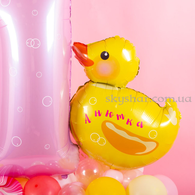 Фигура из шаров с розовой цифрой и надписью "Утенок"