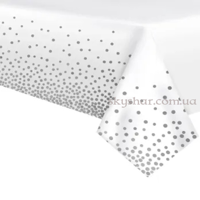 Нарядная полиэтиленовая скатерть для сервировки праздничного стола. Выполнена в белом цвете и украшена рисунком в виде россыпи серебристого конфетти.