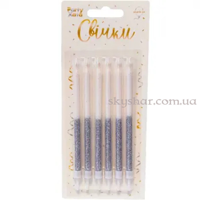 Свічки для торту глітер біло-сріблястий з підставками 12 см 6 шт
