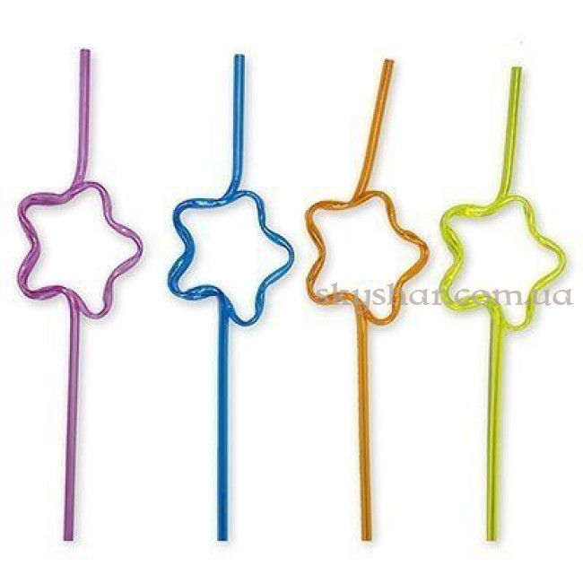 Комплект із 4х пластикових трубочок для коктейлів чотирьох різних кольорів. Трубочки із щільного прозорого пластику зігнуті у формі зірки. Трубочки не гнуться і не деформуються.
